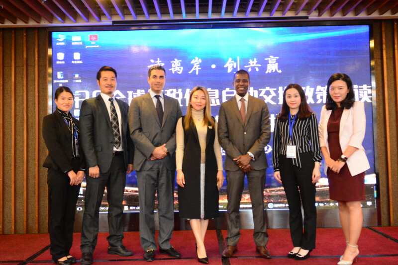晉昇國際執(zhí)行總裁(中間)、移民總監(jiān)唐晨馨(左二)與多米尼克終身大使(右三)、Range公司創(chuàng)始人合影